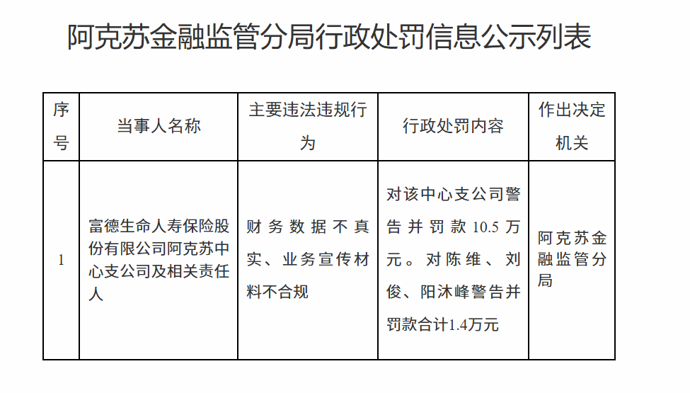 12月4日,阿克苏金融监管分局行政处罚信息公示列表显示,富德生命人寿保险股份有限公司阿克苏中心支公司及相关责任人因财务数据不真实、业务宣传材料不合规被警告并罚款10.5万元。陈某、刘某、阳某峰被警告并罚款合计1.4万元。