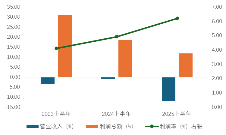 布艺行业近年来下行压力较大。规模以上企业2025年上半年营业收入同比下降19.28%,自疫情后布艺行业增速明显回落,利润总额同比大幅下降46%,利润率近三年也呈现逐渐下降趋势。布艺产品多为半成品面料加工,传统跑量的营销模式由于成本的逐渐攀升和市场结构的变化需要相应调整与升级。